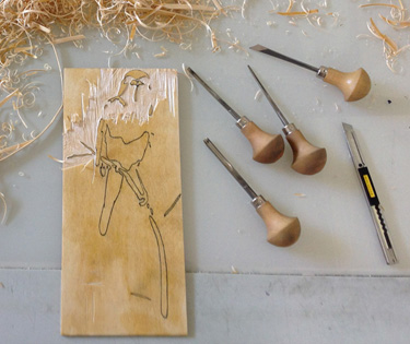 Op veler verzoek zal Erik op zaterdagmiddag 11 juli en zondagmiddag 12 juli in zijn atelier vertellen en laten zien hoe hij zijn houtsnedes ontwerpt, uitwerkt en afdrukt. Als voorbeeld gebruikt hij de houtsnede van een grauwe klauwier. Op de afbeelding ziet u de vierde en laatste plaat van de houtsnede die Erik nu aan het snijden is.